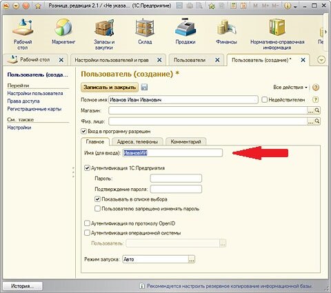 Как видите, рядом с заголовком формы «Пользователь (создание)» появился знак звездочки. Такая звездочка означает, что внесенная информация не сохранена. Если сохранить форму или документ, эта звездочка исчезнет. Чтобы сделать это быстро, можно воспользоваться комбинацией клавиш Ctrl+S.