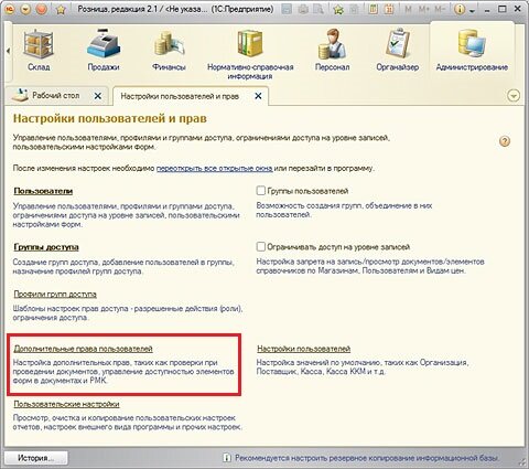 Но в «1С:Розница» существует также дополнительный набор прав, которые дают сотруднику доступ к работе в различных режимах конфигурации. Чтобы получить доступ к их настройкам, нужно снова вернуться в управление пользователями и правами, которое находится в разделе «Администрирование», и зайти в подраздел «Дополнительные права пользователей».