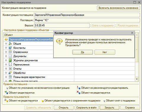 Теперь, чтобы у нас появилась возможность редактировать конфигурацию, мы должны изменить настройки поддержки, поскольку изначально объекты конфигурации защищены от редактирования и при попытке замены этих объектов мы получим сообщение, что они заблокированы.