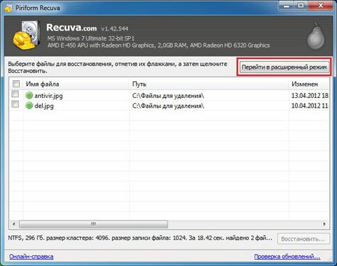 Выполните процедуру поиска удаленных файлов, как это описано в указанной статье (лучше искать не в конкретной папке, а по всему диску, так как файл ранее мог перемещаться). Должен получиться список удаленных файлов. Нажмите кнопку «Перейти в расширенный режим».