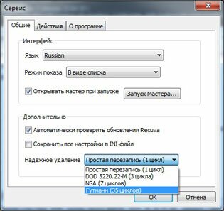 В настройках нас интересует пункт «Надежное удаление». Мы должны выбрать количество циклов перезаписи удаленных файлов. Чем этих циклов больше, тем больше гарантии, что удаленный файл невозможно будет восстановить, но это займет больше времени. На мой взгляд, лучше действовать наверняка и выбирать максимальное количество циклов. Ведь нам нужен положительный результат, иначе зачем бы мы вообще за это брались, не так ли? Выбираем устраивающие нас параметры и жмем «Ок».