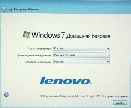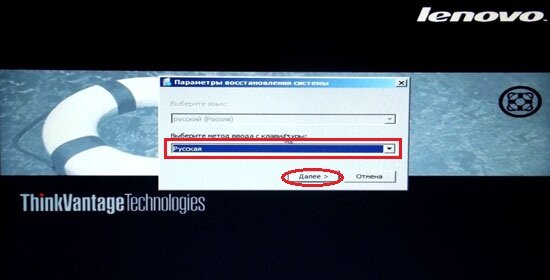 Итак, для того чтобы запустить процедуру восстановления к заводским настройкам, при включении компьютера нужно нажимать клавишу F11. Через некоторое время на дисплее должно появиться окошко с приглашением выбрать язык восстановления системы. Выбираем нужное нам значение и жмем «Далее».