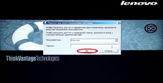 Следующим шагом будет выбор пользователя, от имени которого будет запущен процесс восстановления ноутбука Lenovo. Если выбранная учетная запись защищена паролем, введите его в соответствующее поле и нажмите OK.