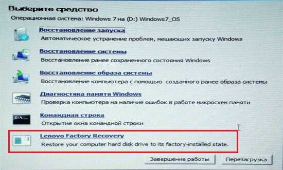 Приложение, восстанавливающее состояние ноутбуков серии ThinkPad, находится в самом низу меню доступных средств восстановления. Нажмите Lenovo Factory Recovery. Это приведет непосредственно к запуску искомого приложения.