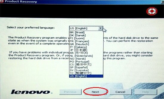 Через некоторое время нам предложат выбрать язык операционной системы. Это значит, что мы достигли цели. Заводское состояние ноутбука Lenovo ThinkPad восстановлено из раздела восстановления.