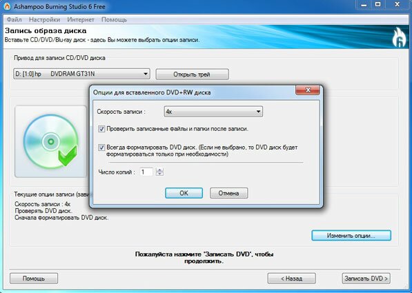 Нажмите «Изменить опции» и расставьте «птички» так, как в приведенной иллюстрации. Скорость записи выставляйте в зависимости от используемого диска.