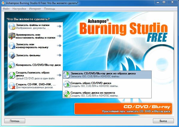 Для записи диска из образа я предлагаю использовать программу Ashampoo Burning Studio 6. Дело в том, что это приложение отлично подходит для записи дисков и при этом абсолютно не уступает коммерческим проектам типа Nero, хотя остается при этом совершенно бесплатным.