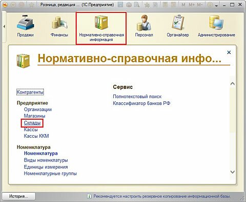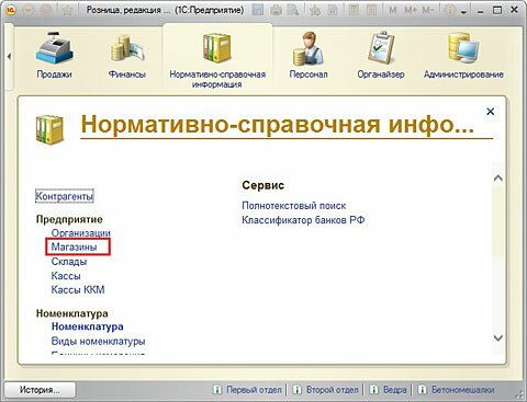 Осталось указать, на каких складах будут храниться товары. Это делается в настройках магазина. Справочник магазинов находится в разделе «Нормативно-справочная информация».