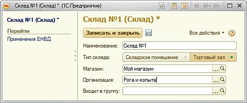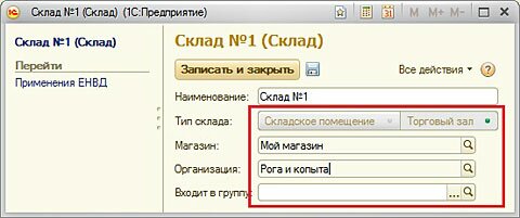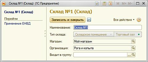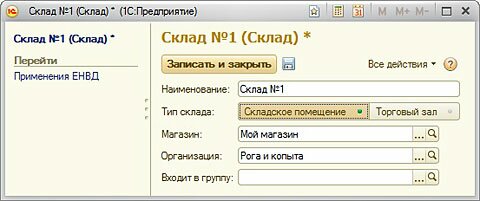 Далее создадим два новых склада, не забыв указать, что они являются торговыми залами. А заодно потренируемся в настройках применения ЕНВД.