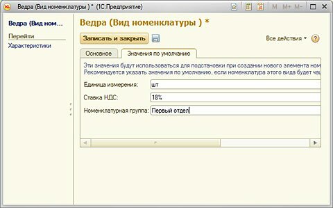 Далее переходим к видам номенклатуры, открываем вид «Ведра» и на вкладке «Значения по умолчанию» указываем, что этот вид относится к номенклатурной группе «Первый отдел». Обратите внимание, что позиция защищена от редактирования. Но мы уже знаем, как с этим бороться.