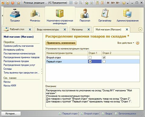 В настройках распределения приемки указываем, что товары номенклатурной группы «Первый отдел» должны поступать на склад «Отдел 1», а «Второй отдел» — на склад «Отдел 2».