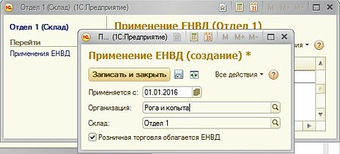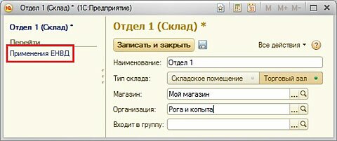 Склад «Отдел 2» можно создать путем копирования склада «Отдел 1», как это было рассмотрено в статье «Горячие клавиши в конфигурациях «1С:Предприятие 8″ и основы работы». Но имейте в виду, что копируется только основная информация. Дополнительные настройки элементов справочника нужно задавать с нуля. В данном случае такой дополнительной настройкой является применение ЕНВД, в случае же с позициями номенклатуры это могут быть различные характеристики, о которых мы говорили в статье про виды номенклатуры.