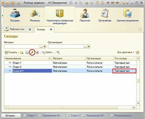 Теперь наши новые торговые залы появились в справочнике складов. Это хорошо, но наш «Склад № 1» все еще является торговым залом. Давайте исправим это. Чтобы приступить к редактированию позиции, нужно ее выделить, а затем либо нажать горячую клавишу F2, либо нажать кнопку редактирования в интерфейсе «1С:Розница», либо дважды кликнуть по нужной позиции.