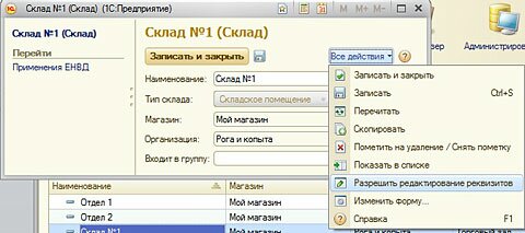 Это сделано для того, чтобы неопытный пользователь не мог случайно изменить важные настройки. Для того чтобы внести необходимые правки, нам нужно предварительно разрешить редактирование этих полей. Для этого нужно нажать на кнопку «Все действия» и выбрать в раскрывшемся списке пункт «Разрешить редактирование реквизитов».