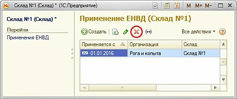 Для начала зайдем в настройки применения ЕНВД и уберем его использование для этого склада. Для этого нужно нажать кнопку удаления в интерфейсе «1С:Розница» или кнопку Del на клавиатуре.