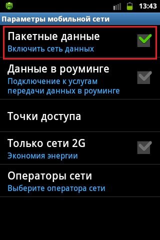 Чтобы подключиться к Интернету через сотового оператора, необходимо зайти Настройки – Беспроводные сети – Мобильные сети и поставить отметку в окошке «Пакетные данные» (разумеется, я предполагаю, что вы уже подключили у оператора необходимую услугу и получили все необходимые настройки доступа).