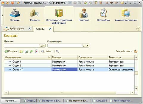 Итак, во время предыдущих занятий мы с вами создали три склада. Из них один является торговым помещением, а два других — торговыми залами. Ранее мы подготовили все необходимое для того, чтобы при поступлении товаров на основной склад они автоматически распределялись бы по торговым залам. Прочитать об этом можно в статье «Классификация номенклатуры в «1С:Розница»: номенклатурные группы и группы номенклатуры».