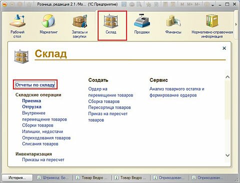Чтобы окончательно убедиться, что товары благополучно встали на учет, можно сформировать отчет, показывающий остатки на складах. Для этого нужно перейти в раздел «Склад» и кликнуть по ссылке «Отчеты по складу».