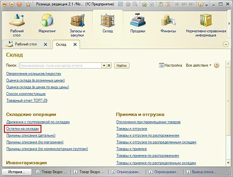 В открывшемся окне нам нужно выбрать отчет «Остатки на складах», который находится в секции «Складские операции».