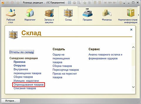 Товары ставятся на приход документом «Оприходования товаров». Документы этой категории находятся в секции «Складские операции» раздела «Склад».