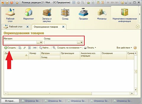Нажав на ссылку, указанную на предыдущем скриншоте, мы попадаем в раздел с документами «Оприходования товаров». На данный момент здесь пусто, поскольку мы пока еще не проводили операций подобного рода. Чтобы приступить к новому оприходованию, нужно нажать кнопку «Создать». Но прежде обратите внимание на поля «Магазин» и «Склад».