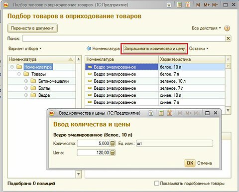 Как видите, перед нами открылся созданный нами ранее перечень номенклатуры, откуда мы можем выбирать любые позиции. Обратите внимание на кнопку «Запрашивать количество и цену». Если она нажата, программа будет спрашивать, сколько единиц отмеченного товара нужно добавить в документ и какова его стоимость. Если эту кнопку не нажать, каждый раз при выборе будет добавляться по одной единице товара.