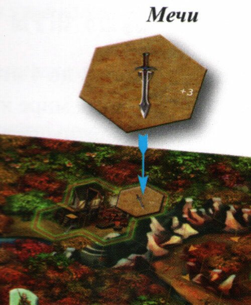 В описании подготовки к игре указано, где на карте выкладываются артефакты и заклинания. При этом говорится, что нужный гекс для удобства отмечен изображением выкладываемого предмета. Но в кузнице, где герои могут взять меч, он нарисован совсем не на том гексе, который в правилах помечен для выкладки.