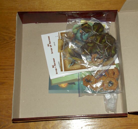 В коробке находим правила игры, листы персонажей, картонные фишки персонажей (героев, монстров и Мантикоры), подставки для фишек, жетоны артефактов и оружия, тайлы с участками дороги, тайл с изображением Мантикоры, кубик и несколько форм. На этих формах находится карты боя и круглые маркеры, которыми отмечаются различные характеристики персонажей.