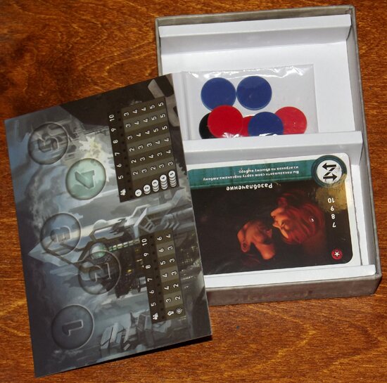 Сверху всего этого лежит информационное табло, на котором маркерами отмечаются результаты миссий. На нем же находятся две таблицы, в которых указываются соотношение членов сопротивления и шпионов, а также количество отрядов для выполнения каждой из миссий при разном количестве игроков. Это очень удобно, как так не нужно постоянно нырять для сверки в правила.