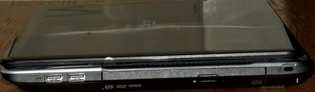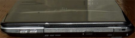 На левом торце ноутбука находятся гнездо для сетевого адаптера, порты VGA и HDMI, два разъема USB, а также разъемы для внешнего микрофона и наушников. Здесь же находится основная часть вентиляционных отверстий, поэтому с этой стороны доступ к ноутбуку лучше ничем не блокировать.