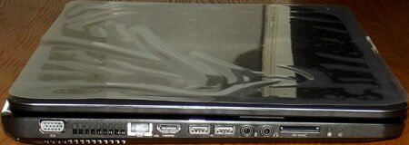 На левом торце находятся порты VGA и HDMI, разъем Ethernet, два USB-разъема, а также гнезда для подключения наушников и встроенного микрофона. Еще здесь можно увидеть индикаторы питания, жесткого диска и несколько вентиляционных отверстий, к которым должен быть постоянно обеспечен приток воздуха.