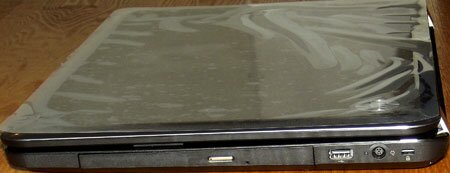 На правом торце находятся оптический привод, еще один разъем USB, разъем для замка типа «Кенсингтон» и оснащенное индикатором гнездо сетевого адаптера.