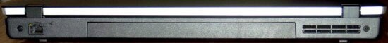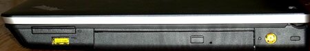 На правом торце можно увидеть один разъем USB, слот ExpressCard для подключения устройств с соответствующим интерфейсом, оптический привод, а также разъемы для замка типа «Кенсингтон» и сетевого адаптера.