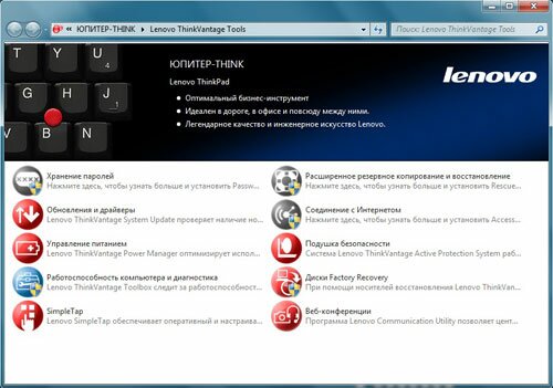Еще одним приложением, заслуживающим внимания, можно назвать Lenovo ThinkVantage Tools. Из его интерфейса можно выполнить обновление драйверов, произвести более тонкую настройку профиля энергосбережения, чем это можно сделать стандартными средствами Windows. Также отсюда можно производить восстановление системы, настраивать акселерометр, оберегающий жесткий диск от толчков и ударов или поучаствовать в веб-конференции.