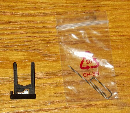 Эти салазки одновременно служат и держателем SIM-карты, и защитной крышкой слота. Чтобы извлечь их, необходимо засунуть в расположенное на их крышке отверстие разогнутую скрепку, которая неожиданно даже оказалась в комплекте.